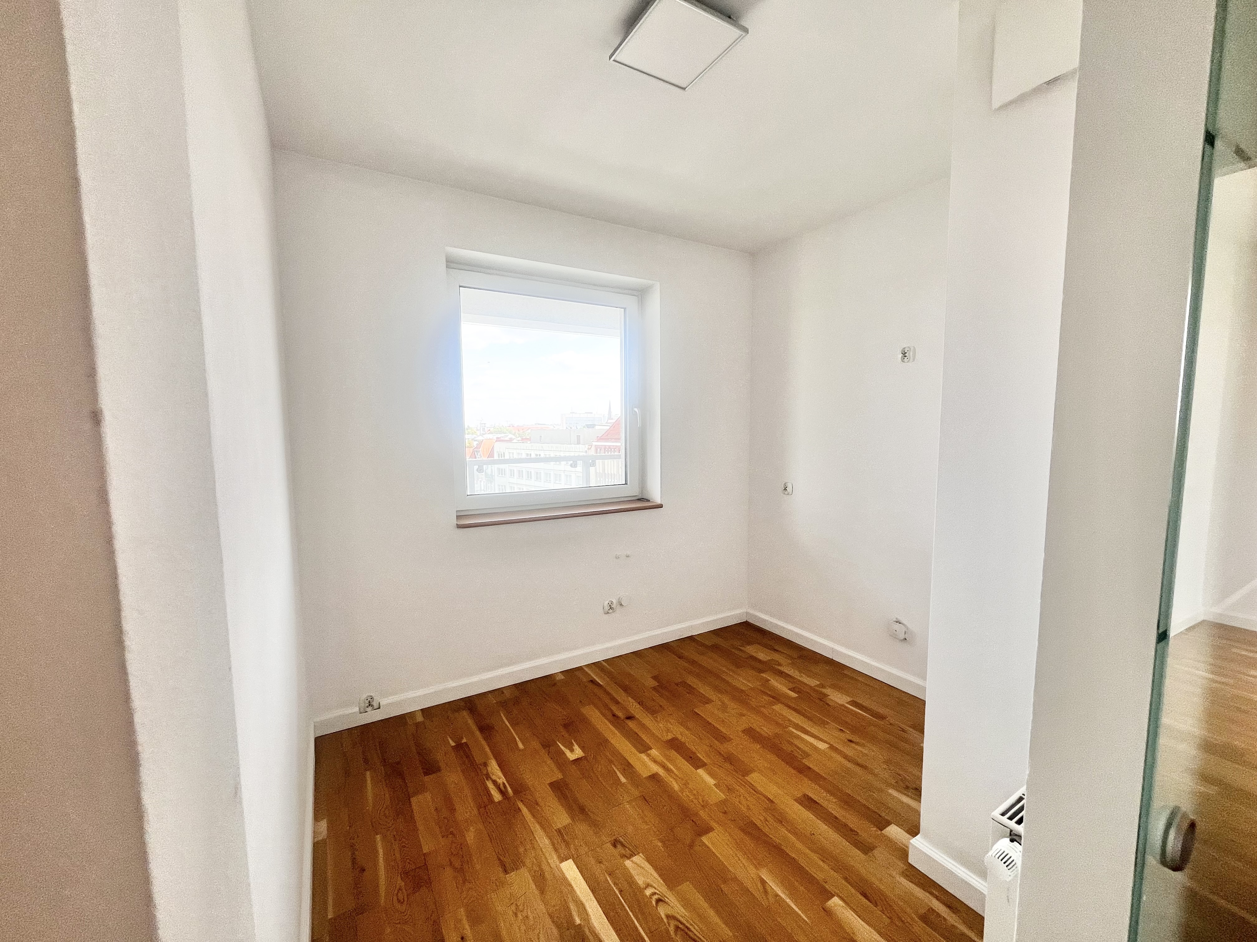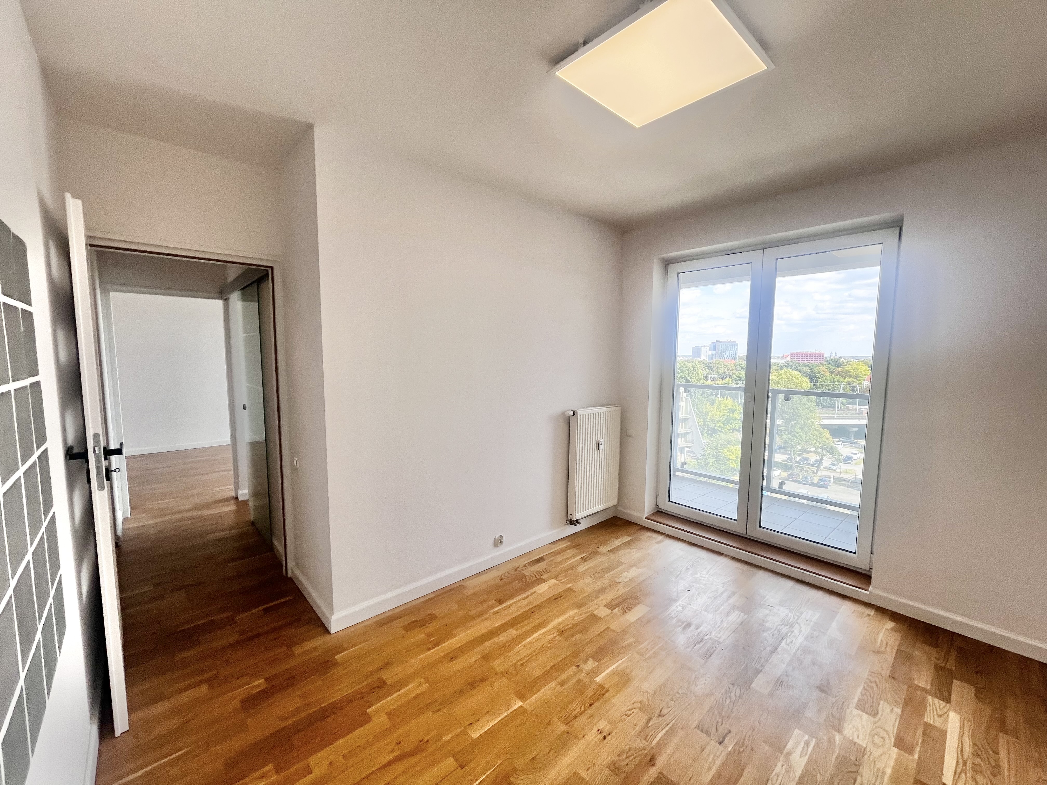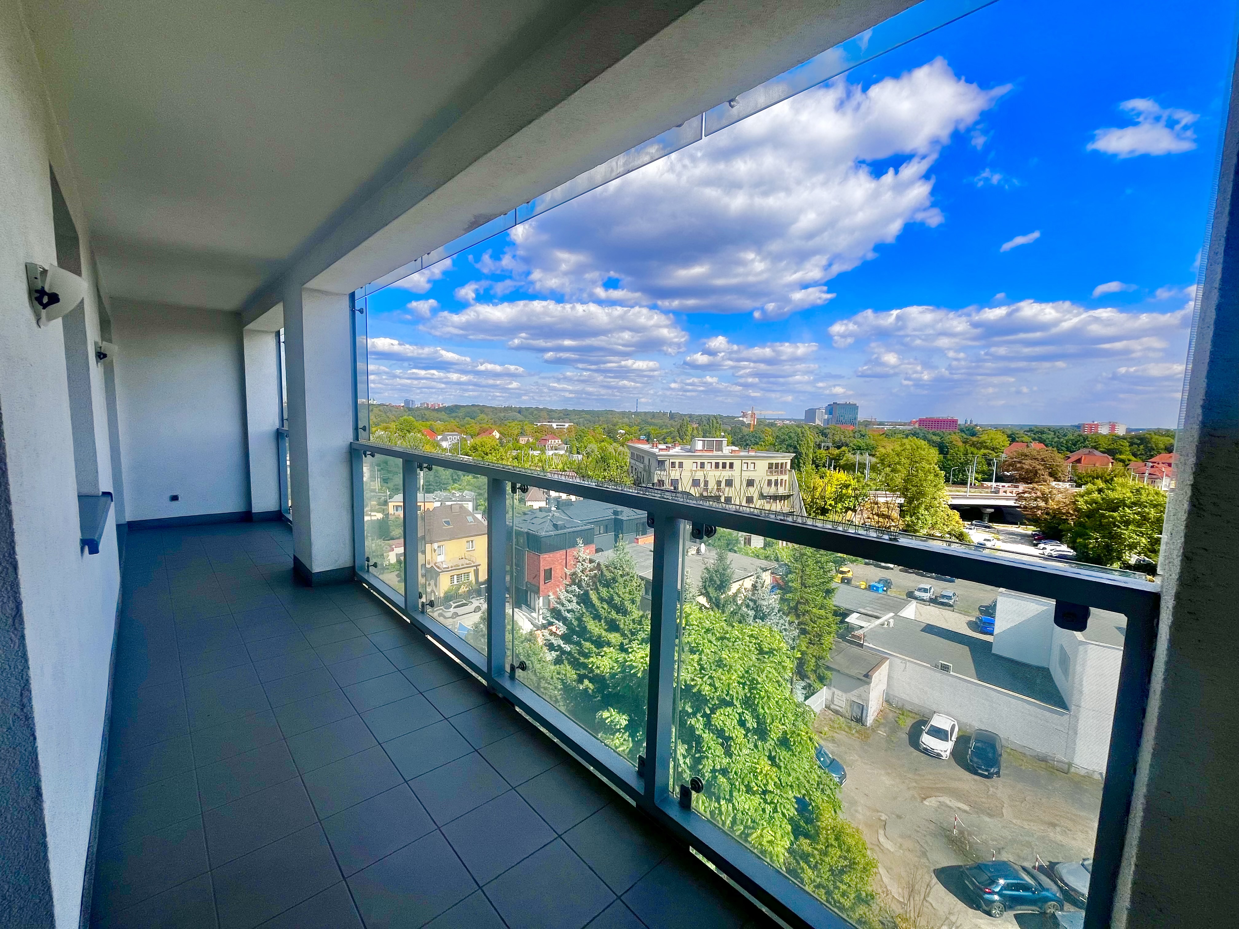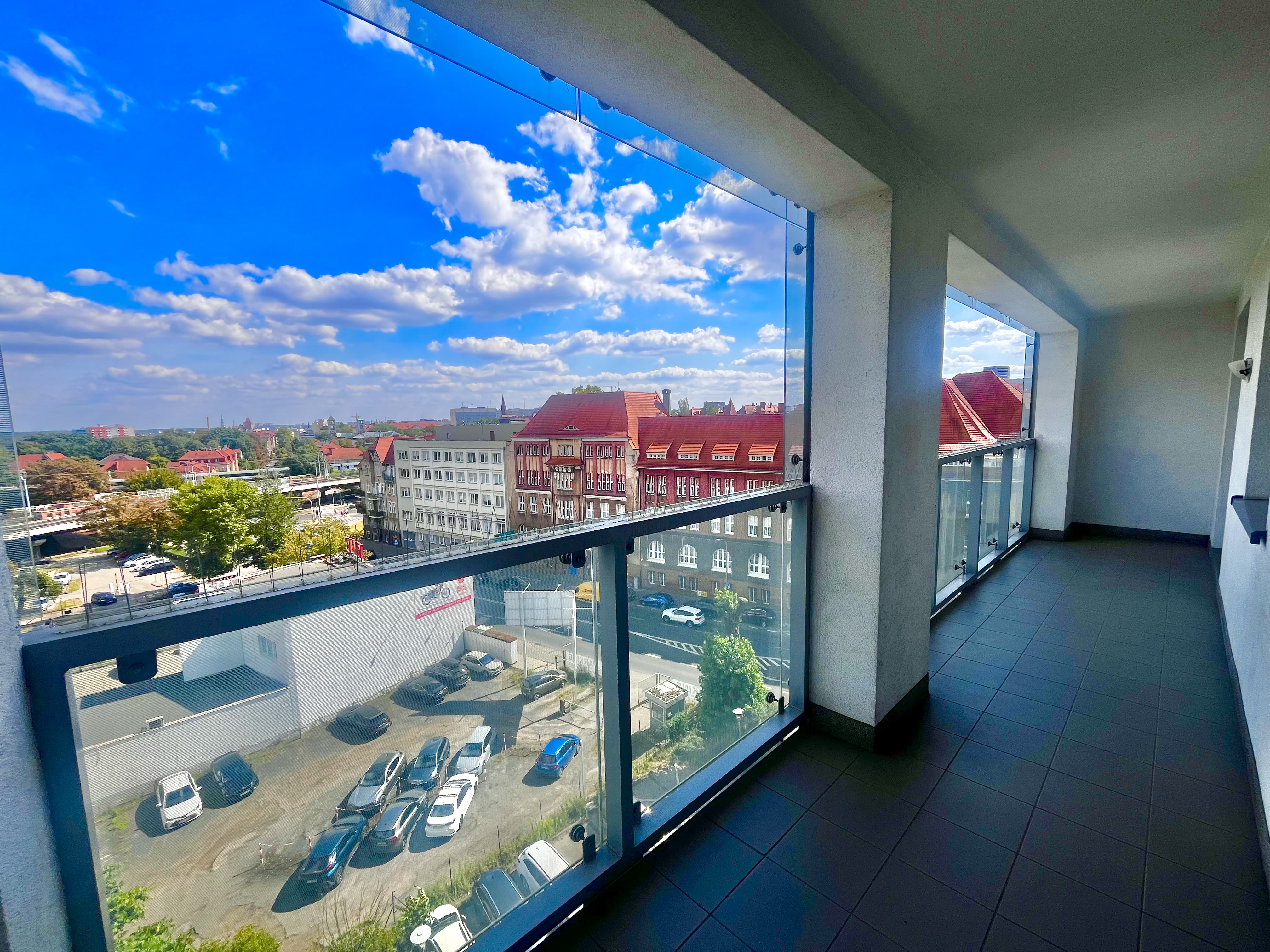 Lokal znajduje się na 6. piętrze i posiada długą loggię ciągnącą się przez całe mieszkanie – z wyjściem z obu pokoi. Okna wychodzą na południe, co zapewnia piękne, naturalne doświetlenie przez cały dzień oraz widok na zieleń i otwartą przestrzeń – pełen komfort i prywatność w centrum miasta.